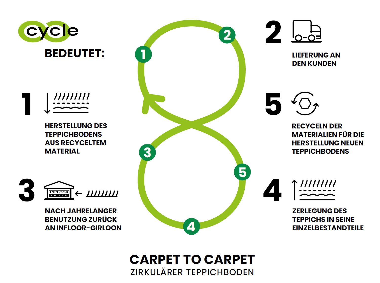 Wir setzen somit nicht nur auf den Einsatz von recycelten Materialien, sondern sind die Ersten, die die Möglichkeit schaffen, die Einzelkomponenten des Bodenbelages dem endlosen Kreislauf immer wieder zurückzuführen.